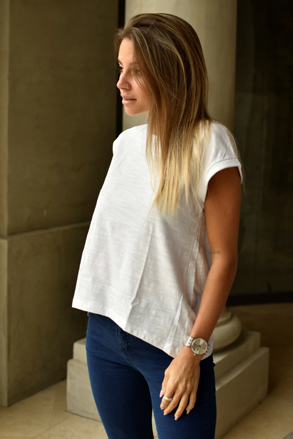 Ésta moderna remera Tania destaca por su diseño fresco y relajado, ideal para un look casual y desenfadado. Con mangas cortas que caen suavemente sobre los hombros, ofrece una silueta que realza la figura y aporta un toque femenino.