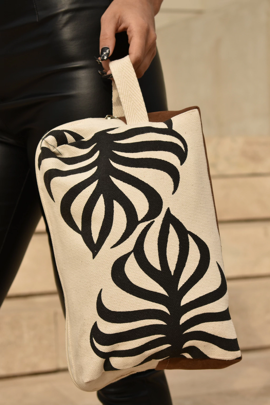 Este neceser es la unión perfecta entre estilo y practicidad. Confeccionado en lona estampada en blanco y negro y base de gamuza suave, aporta un toque elegante y distintivo.