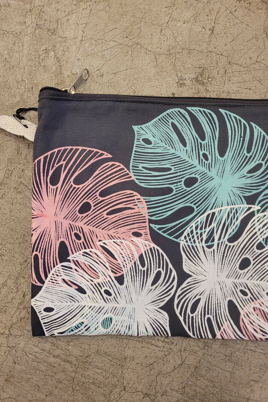 Mantén todo organizado con estilo. Esta práctica bolsa cuenta con un diseño moderno de hojas tropicales en tonos pastel sobre fondo oscuro. Está fabricada con tela resistente y forro plástico en el interior, ideal para proteger contra humedad y facilitar la limpieza.