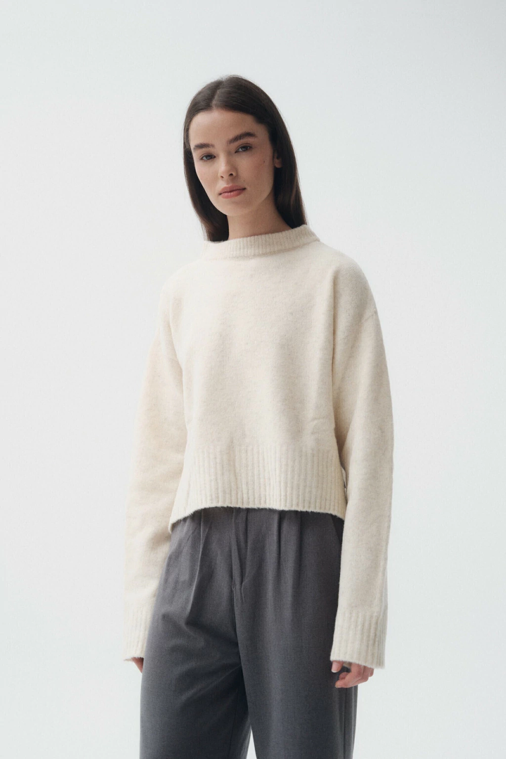 Sweater tejido en color crudo, de calce recto y largo a la cadera.